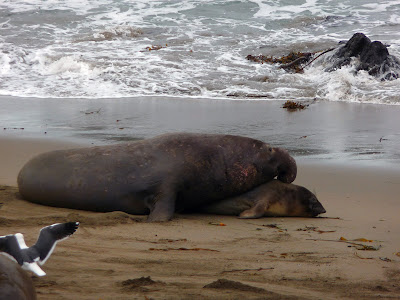You know how it is when you live in a tourist area... Somehow I never seem to have time to soak in the wonderful sights around the area unless we have visitors. I've been trying to change that lately. I carry my camera around with me all the time. If I see a shot - a beautiful sunrise, the glassy back bay on my way to work - I've been making a point to actually stop an take the picture. Toward that end, on Saturday I took Ben, Danny and my mother-in-law up the coast to check out the elephant seals. I've only lived here 21 years and never seen them. Well, I did sort of see them a few years ago when my girlfriend from Maryland came to visit. But there were hardly any seals on the beach so I don't really think it counts.